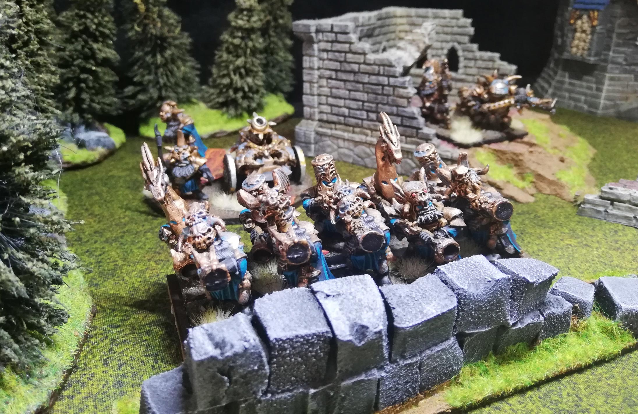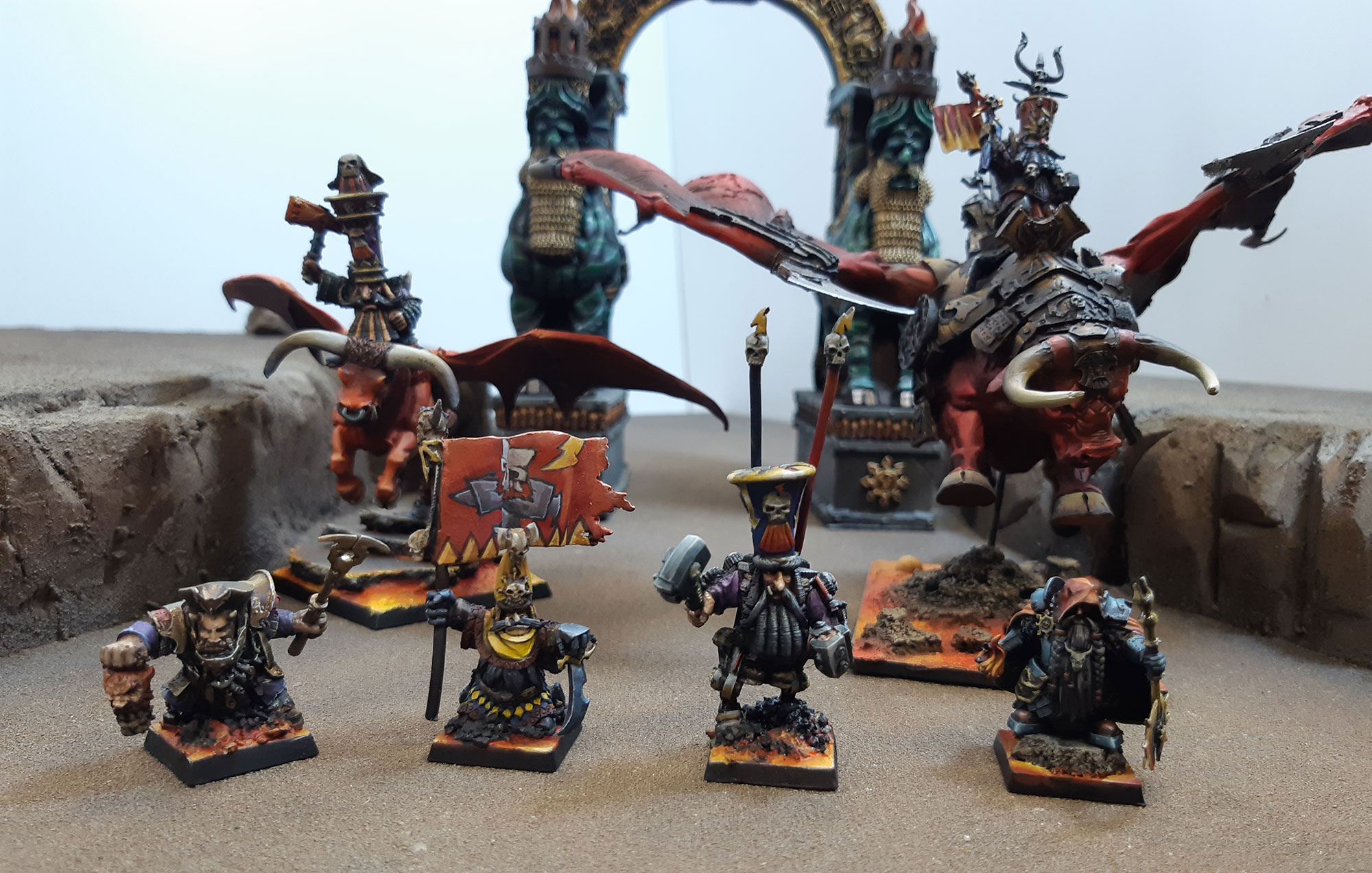Separated from their brethren in the trials of the Ages of Ruin, the Eastern Dwarves turned to darker means of survival. Though "Infernal" is used to describe these beings and their cruel nature, the term derives from the disastrous creation of the Inferno - a vortex of fire and magic, the genesis of the Wasteland, and the catalyst of the Ninth Age. Unlike their subterranean cousins in the west, they build great stone ziggurats above ground, while their vast, slave-worked mines fuel a technological industry rivalled by few, if any. Their control over much of the trade from the East, combined with devilish weaponry, enables the Infernal Dwarves to stand against the collective loathing of Vetian civilisation.